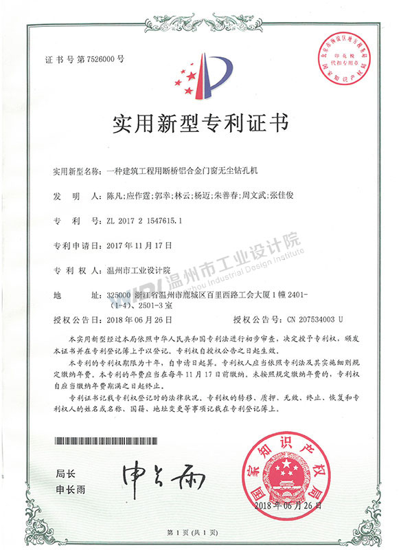 一種建筑工程用斷橋鋁合金門(mén)窗無(wú)塵鉆孔機(jī)證書(shū)